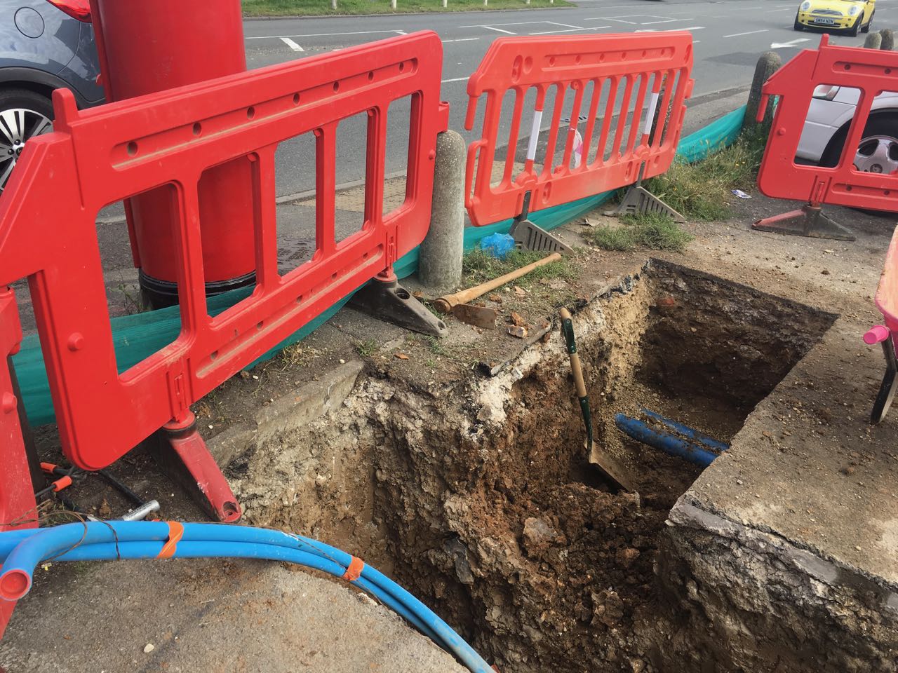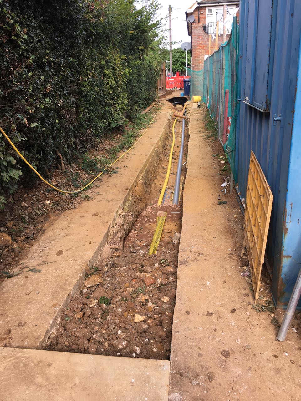 As the water, electric and BT services still had to be run from the mains, the trench was left open by the public-private boundary, as well as at inspection points further towards the houses.
